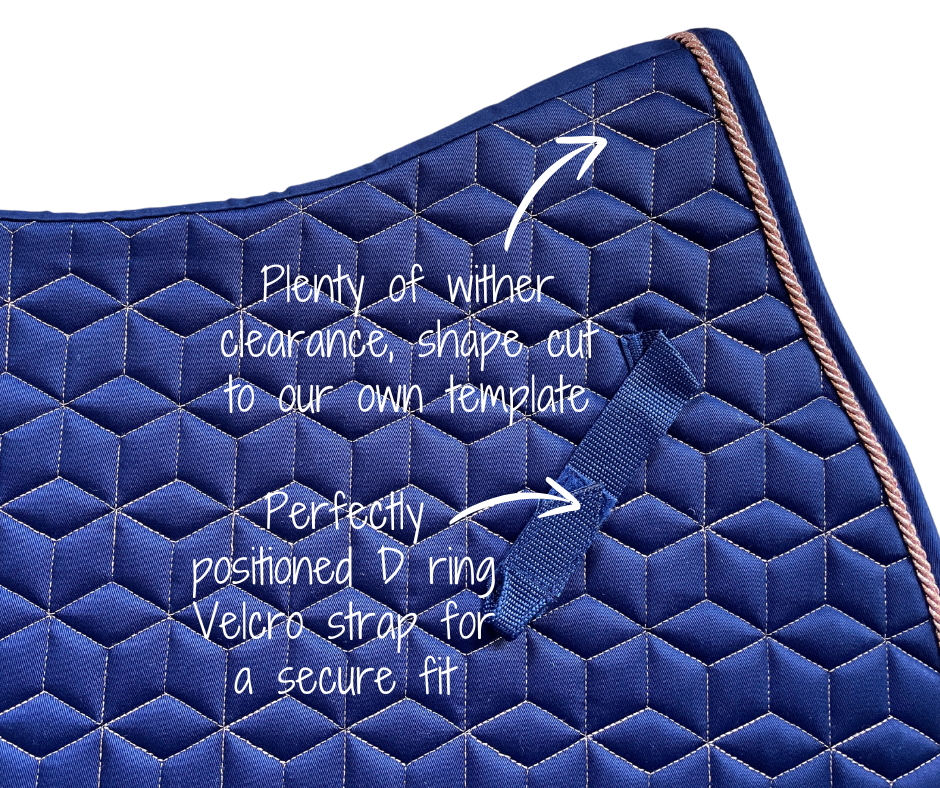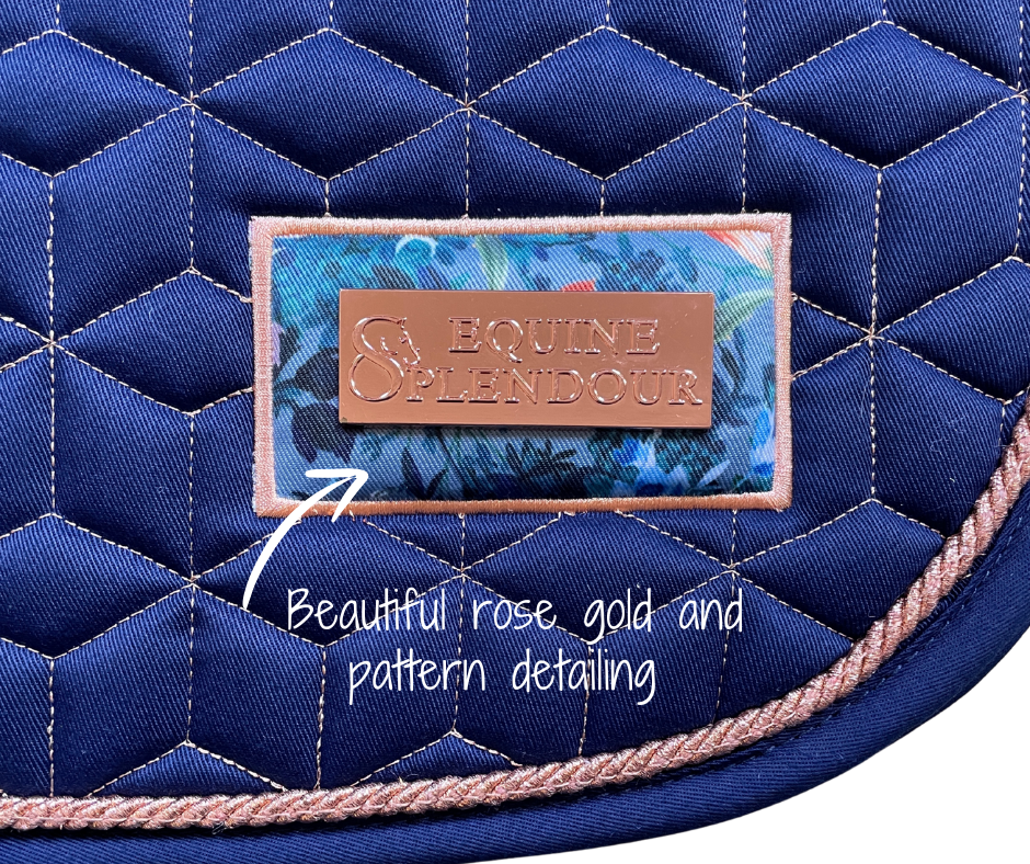 Dress your horse in this beautiful and timeless saddle pad, made from a high quality fabric with stunning rose gold thread through the geometric quilting and piping round the edge. We've added a little bit of our Botanic Navy pattern to the metal logo, as we all love a matching outfit!