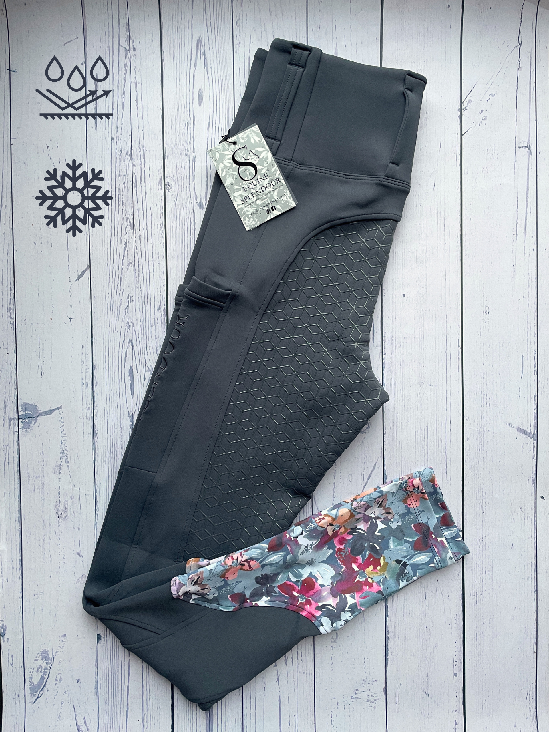 Slate Grey Floral All Season Full Seat Riding Leggings/Tights - Water Resistant